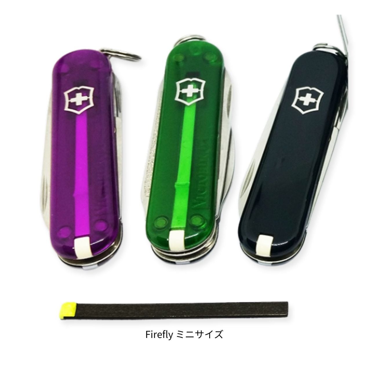 Fireflyは、ビクトリノックス・スイスアーミーナイフ(SAK)の「つまようじ」と交換して装着できる、画期的なファイヤースターターです。あなたのEDC(毎日持ち歩く道具)に、確実な火種を追加します。